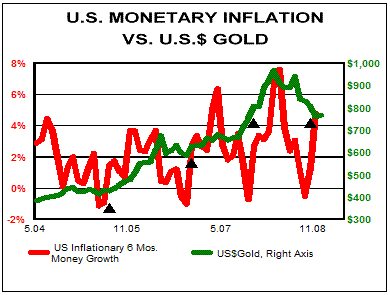 Second graph is an update of one introduced earlier. Green line is monthly average price of $Gold, using right axis. Red line, using left axis, is the inflationary component within the annualized six month rate of change for the U.S. money supply, M-2 NSA. Buy signals of that monetary measure are when it turns positive from a negative value. Currently, the monetary measure is extremely bullish for $Gold. Those buy signals are marked by black triangles.