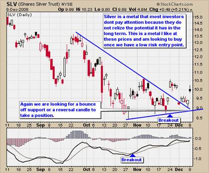 I have had my eye on silver for several years watching it go from $5 to over $20 within 5 years. That's an average of 60% per year return which is what opened my eyes to his shiny metal. Silver is a metal, which only a small group of investors actually own compared to its popular sister (Gold). That being said, most investors only jump on the band wagon after things become popular. Silver in my opinion could be the next really big winner. I do think Gold and Oil will be much higher in the long term, but will not offer the type of returns silver could yield us. So, this is why I am pointing out silver at these prices and looking for a low risk entry point. Silver is down over 50% from its highs and also looks to have found support at long term support levels.