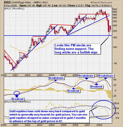 The Gold Bugs Index is a great indicator and generally I find it leads the price of gold for up to 4 days on the daily chart and up to 2 months on the monthly chart in some situations. The monthly chart of the HUI shows a very clear picture, as to where we stand for gold and gold equities. Again we have had a solid bounce off support, but what we really want to see here is the HUI to continue climbing faster than the price of gold, which will help confirm the bottom for gold prices. It is important to note that bear markets tend to pull all stocks down with it, which is why the ratio between the price of gold and gold stocks is so extreme. As sellers force stocks down in fear of losing more money, investors are slowly buying gold, as it is generally a safe haven during times like these providing some support for gold.