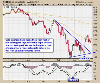 The daily HUI chart (gold Stocks) is something I pay close attention to, simply because gold stocks generally out perform the price of gold in rallies. As you can see in the chart below, the gold bugs index has made a higher low and a higher high. This is generally the first sign of a trend change. If the HUI does not break below our support trend line and we get a bounce, then we will be looking to buy gold equities and gold with low risk setups (risk under 3%).