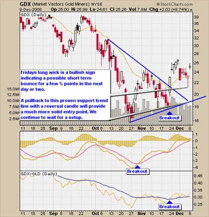 When trading gold stocks I prefer to trade the GDX exchange trade fund, because it provides excellent liquidity and performs very well with my trading model. It also holds high quality PM (Precious Metal) stocks. As you can see from the chart below, it looks very similar to the gold bugs index (HUI). Price action for this fund looks strong and if we get a low risk setup within in the next 1-3 weeks, we will put money to work with this fund.