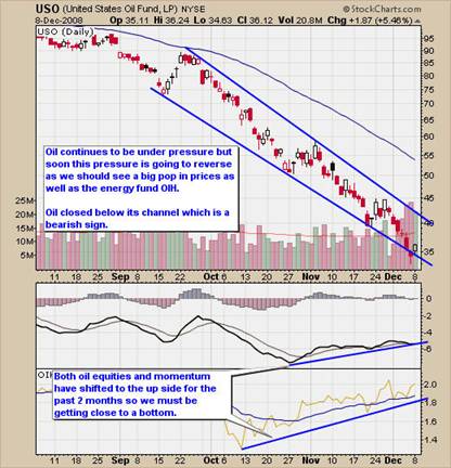 I currently do not see any near term setups in Oil or Oil equity funds, and the chart below shows how momentum for Oil and Oil equities are trending up, while Oil continues lower. This is a bullish sign for crude but I want to see some foundation building before we put money into energy. I'm thinking we are getting close to a bottom but generally 75% of the move comes during the last 25% of the time. Trading low risk setups is important when trading in high volatility markets like this.