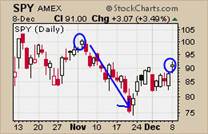 Monday the NASDAQ 100, SP500 and Dow all gapped higher with average volume above the recent consolidation levels. This appears to be the same setup we had on November 4 th which was an exhaustion gap followed buy heavy selling down to new multi year lows. The chart below is of the SP500 ETF but the QQQQ and DIA all show the same price action. I'm not saying we are headed lower but caution must be taken here incase this play like it did a month ago.