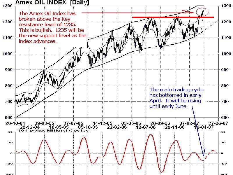 After 10 months of consolidation below the key 1235 resistance level, the Amex Oil Index (Chart 1) has broken out above this important price ceiling. This indicates the main upward trend in the oil sector is now continuing. And as the Amex Oil Index often leads the commodity, it also implies oil prices will remain firm at current levels as the summer driving season draws near.