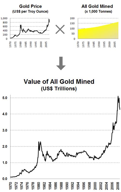 For example, the 10-31-2008 closing spot price for one troy ounce of gold was US$806.62. Multiplied by the corresponding quantity, the total value of all gold ever mined was US$4.3 trillion. This is just slightly more than the $4.03 billion global M0 money supply from Figure 2 above.