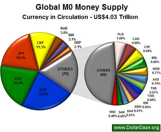 The following pie charts on Figure 2 below show the relative value of global currencies (M0) when converted to USD for means of comparison.