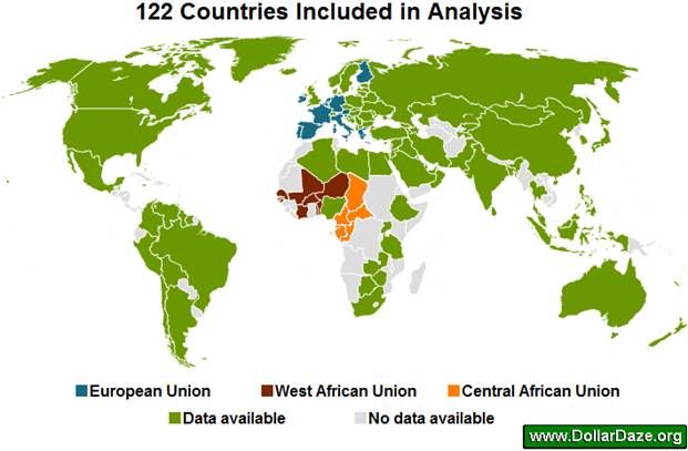 The five currency unions and 81 independent currencies cover a total of 122 countries that make up 98.4% of the world's GDP and 86.1% of the world's population . Figure 1 below visualizes the coverage. Areas with grey color on the map represent countries without available data. Areas with blue, red, and orange color represent the three most important economic unions, respectively the European, the West African, and the Central African Unions.