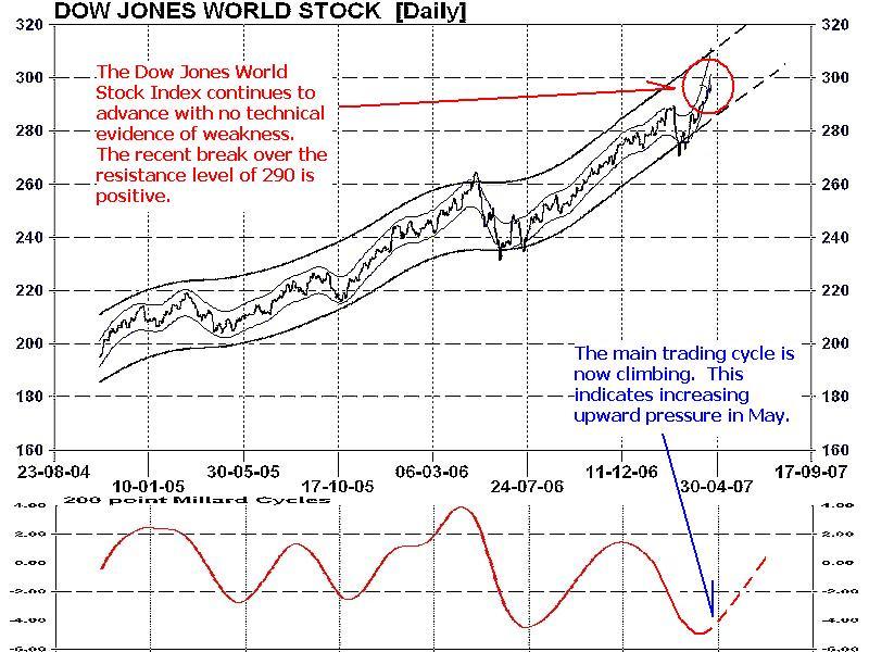 The Dow Jones World Stock Index (Chart 1) is the best measure of global equity markets. This index of over 3,000 companies from 120 countries shows a clear path of higher numbers moving into the summer months. Technical evidence from the main trading cycle (lower portion of Chart 1) indicates a low in mid-April and rising throughout May and June.
