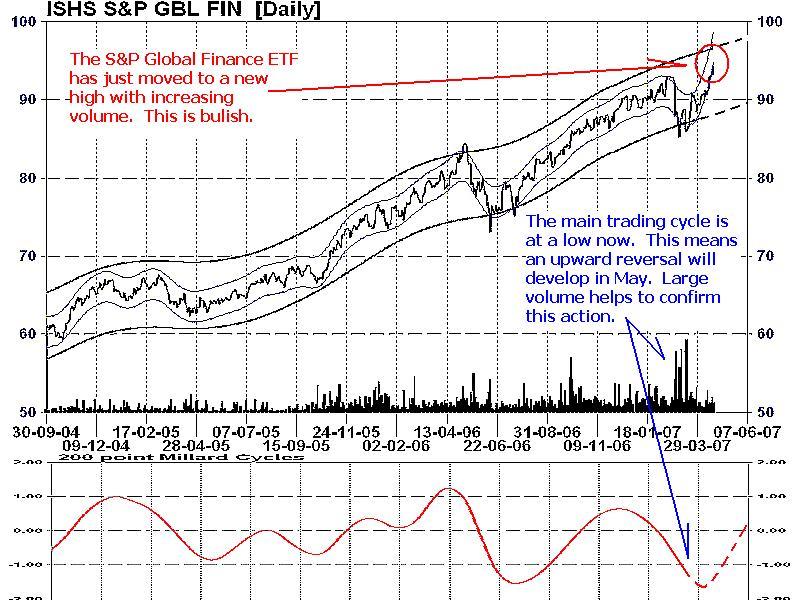 Financial sectors are reliable leading indicators on the general equity markets because this group reacts faster to rising or declining interest rates. Chart 2 displays the exchange traded fund (ETF) of the S&P Global finance iShare. This security continues to advance higher with mounting buying volume. The main trading cycle, like the Dow Jones World Stock Index, has reached a bottom in mid-April and will be gradually turning up over the next few months.