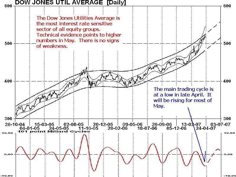 Presently, this average has advanced to a new high. Technical data from the main trading cycle (lower portion of Chart 3) indicates a rising pattern in May. Currently the Dow Jones Utilities Average is displaying no signs of weakness as it moves into summer.