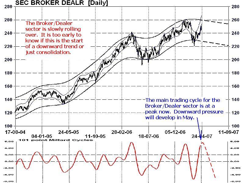 MY CONCLUSION: Chart 1-3 all remain positive with additional growth anticipated moving into the summer months. Chart 4 of the Broker/Dealer sector remains flat which is neither negative nor positive. A decline through the 220 support level would cause some concern, but current levels only call for a watch and wait approach.