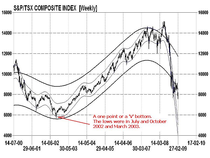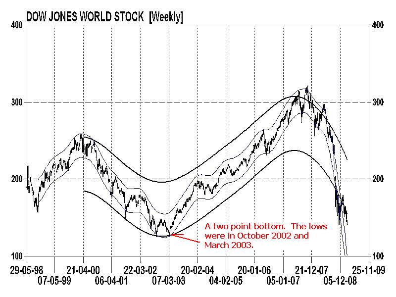 With evidence and assumptions dictating that the final low should occur this year, how will the bottom unfold? Bear market lows develop in three basic forms. Indexes either test a new low level once, twice or three times before starting a new bull market. In Charts 2-4 of the S&P/TSX, Dow Jones World Stock Index and the S&P 500, the three standard bear market bottoms are illustrated. The S&P/TSX reached a final low only once in October 2002 and than advanced. This was largely due to the strength of commodities.