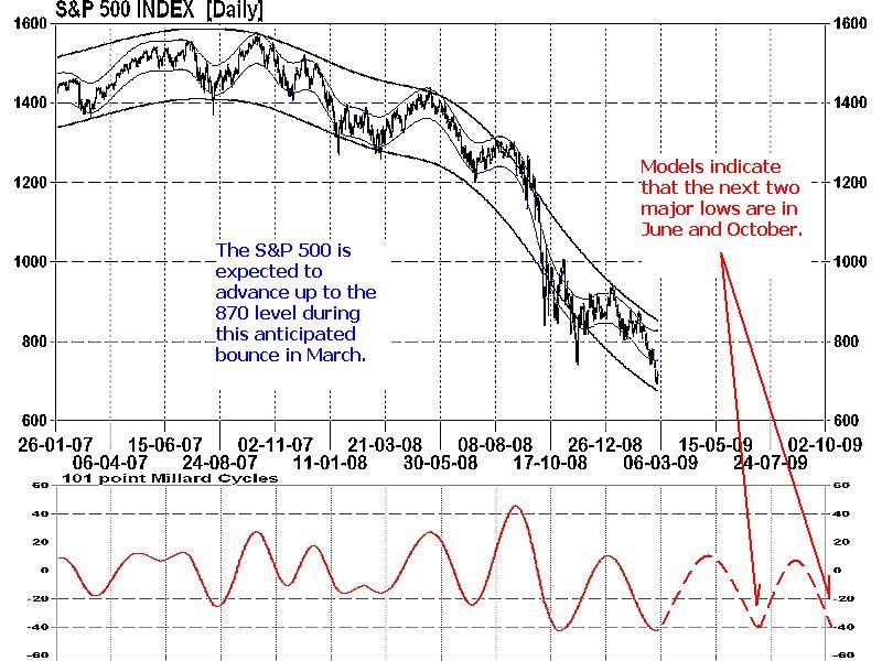 Bottom line: Bear market bottoms can develop in any of the three forms. However, as global equity markets are tightly linked, they typically all reach their lows during the same months and often on the same day. With models indicating that major troughs are expected in June and October this year and another in March 2010, there is a 75% probability that the last bottom of this severe bear market should occur in June or October and with a possible retest in March. The assumption is that the end will develop this year verses June or October 2010.