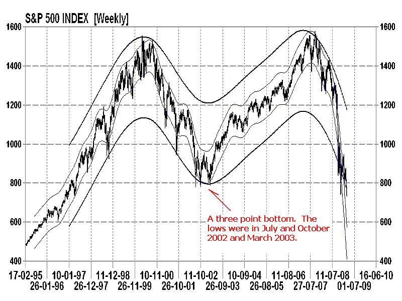 This probability analysis also applies to a technical review. Mathematical models can show where the greatest likelihood of major lows will develop in the future and, coupled with historical data, the time frame for the bottom of the bear market can be estimated.