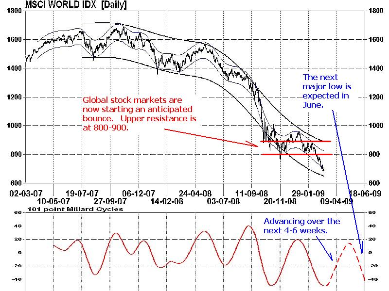 Models have indicated, for several weeks, that an advance in the equity markets during March could be expected. The positive news from Fed chairman Mr. Bernanke and Citigroup today has provided the trigger for that bounce. Technically, this upward movement is considered to be a bear market rally and is part of the on going milder downward trend in 2009. As the next major low is expected in June, this bounce should fade by mid-to-late April or before.