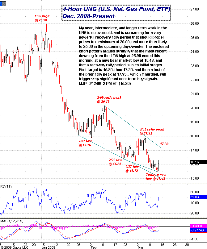 My near, intermediate, and longer-term work in the U.S. Natural Gas Fund ETF (NYSE: UNG) is so oversold and is screaming for a very powerful recovery rally period that should propel prices to a minimum of 20.00 and more than likely to 25.00 in the upcoming days/weeks. The enclosed chart pattern argues strongly that the most recent downleg from the 1/06 high at 25.98 ended this morning at a new bear market low of 15.48, and that a recovery rally period is in its initial stages.