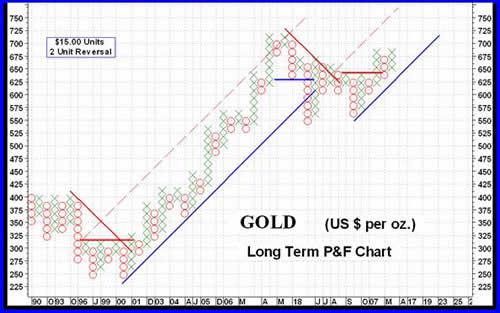 The gradual uptrend of the past 6 weeks has brought gold once again to a critical juncture. This rise has brought it up to the late February high and within $40 of last year's highs at about $730, raising hopes that it may soon break out to a new high.