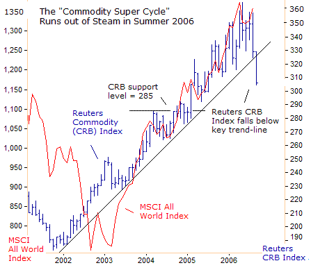 Since reaching a 25-year high of 365.45 on May 11 th , the Reuters Commodity Index, (CRB index), has been showing signs of fatigue, after a relentless four-year climb. The CRB index doubled from four years ago, led by commodity superstars, such as crude oil, copper, gold, platinum, silver, and sugar. However, since topping out three months ago, the CRB index has slumped about 9%, whipping up speculation that the 'Commodity Super Cycle' is fizzling out.