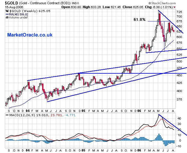 After peaking at over $730, Gold corrected to 540, and the subsquent rally brought gold right to the 61.8% Fibanacii retracement which held ! This strongly suggests that gold has further downside to go, before it can resume the bullmarket.....